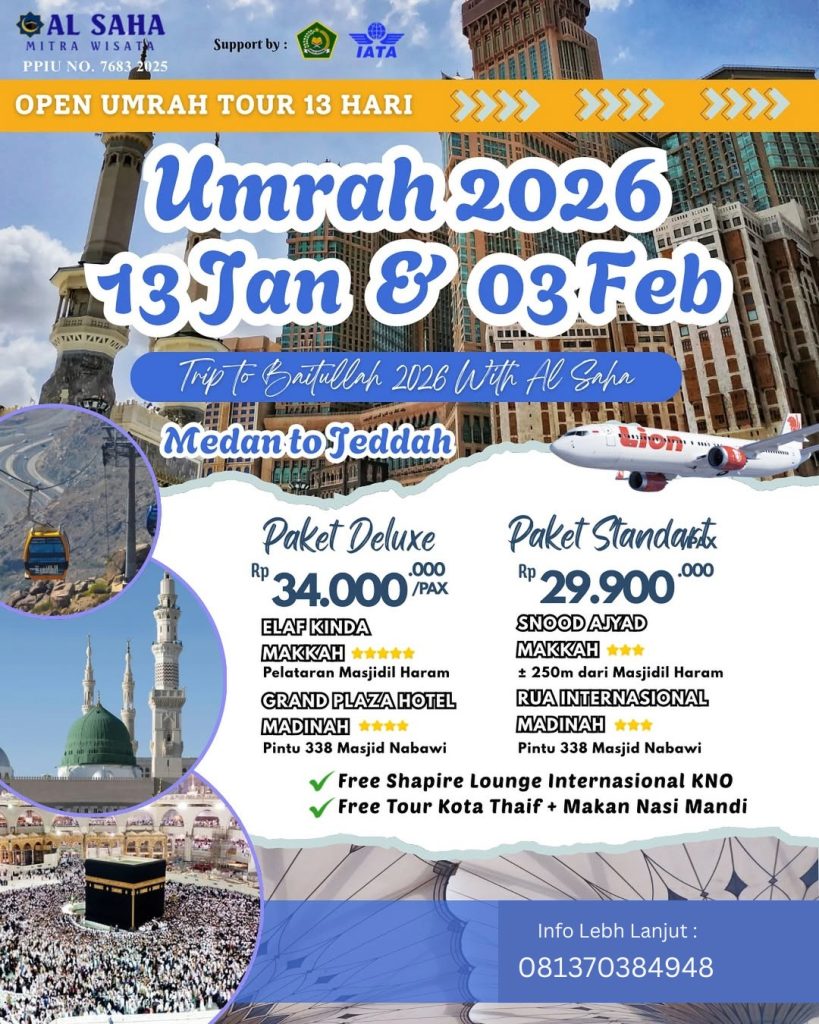 Keberangkatan 13 Jan & 03 Feb 2026 (Deluxe) Lion Air Mekkah - Elaf Kinda , dekat Pelataran Masjidil Haram Madinah - Grand Plaza Hotel, Pintu 338 Majid Nabawi 13 hariRp.34.000.000 Info Lengkap