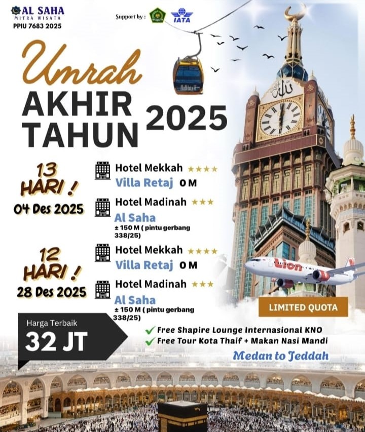 Keberangkatan 4 Des 2025 Plus Thoif Lion Air Mekkah - Villa Retaj - 0 Meter Madinah - Al saha (+/- 150 Meter) 13 hariRp.32.000.000 Info Lengkap